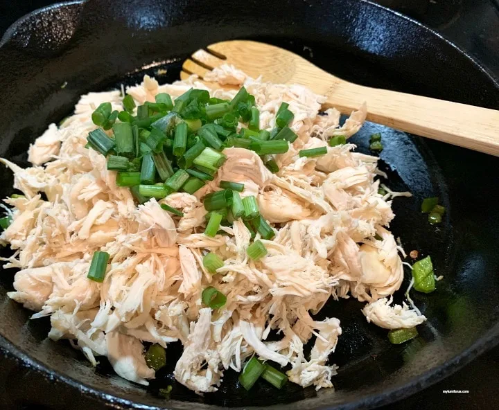 • Add the shredded chicken breast to the skillet and about 3 of the chopped green onions (save the last one for garnish). Stir to combine.