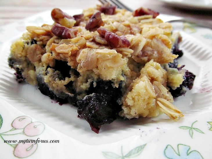 Sweet berries, with the buttery cake, topped with a streusel of pecans and oatmeal make this a very special dessert. And it brings a normal blueberry cobbler to a whole new level. This is one of those special go-to recipes. It’s a recipe that you will make over and over again because you probably have the ingredients handy most of the time. It’s so much easier than a normal blueberry cobbler. And what can be greater than that?