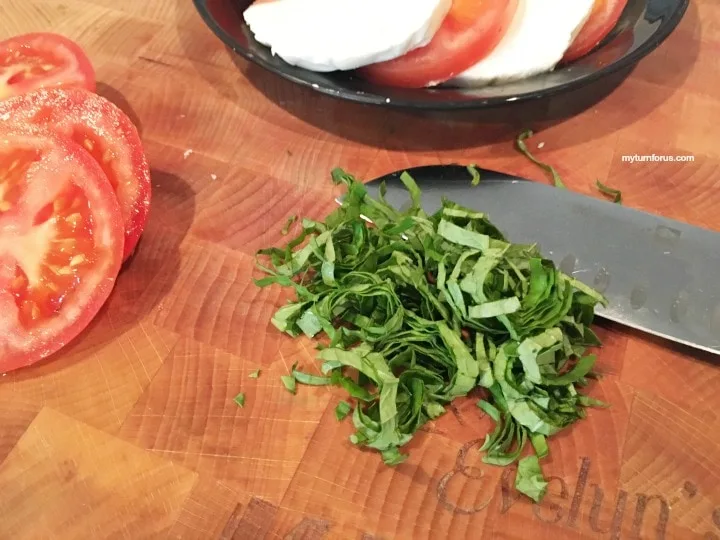 - Slice basil leaves into ribbons and sprinkle on top of the tomatoes and cheese