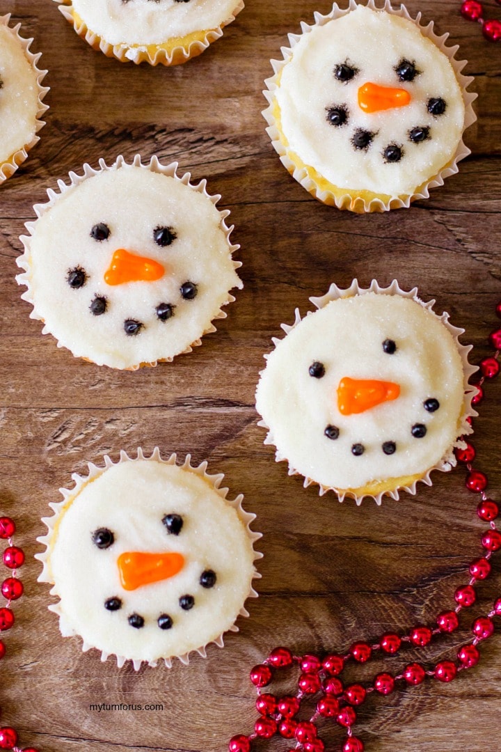Make these super easy and super cute Snowman Cupcakes from a cake mix. Also you use a pre-made frosting to make the simple snowman cupcake faces.