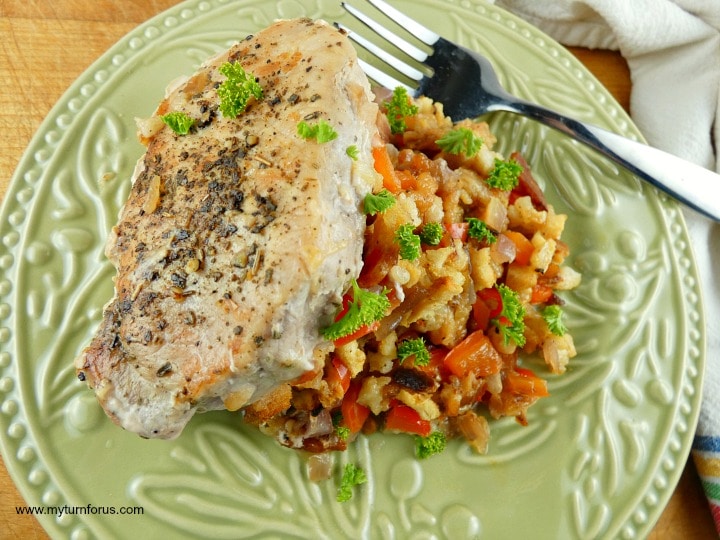 Our pork stuffing recipe replaces some of the heavier stuffing with veggies and adds some extra flavor. Also, we choose leaner pork chops and trimmed off the extra fat.