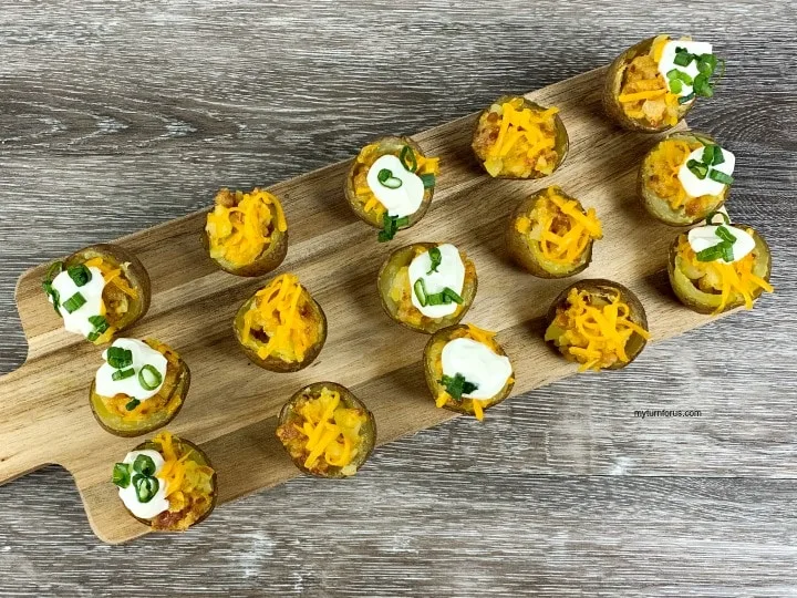 Remove from oven and top with remaining ¼ cup of shredded cheese. Serve these mini potato skins with a dollop of sour cream and sprinkle with chopped green onions.