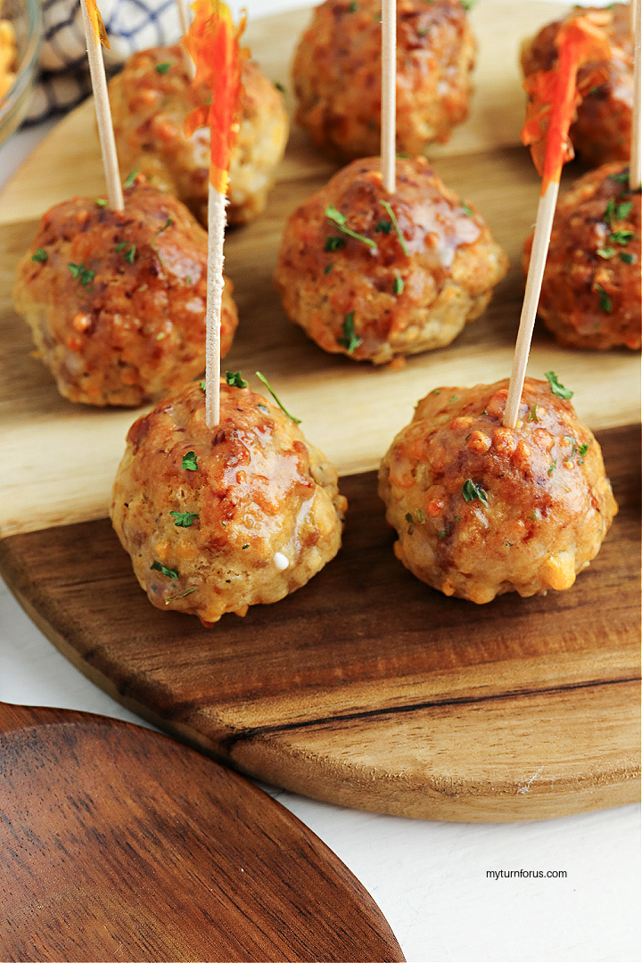 - Garnish with chopped parsley (optional) and insert a festive tooth pick into each sausage ball and serve immediately.
