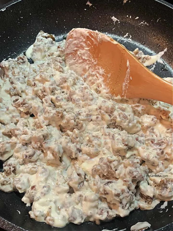 - As the cream cheese melts stir until the sausage and cream cheese is completely combined, remove from heat and set aside.