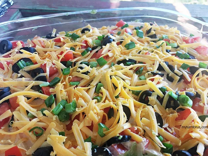 This 7 Layer Dip is so colorful and has an amazing combination of flavors. And this 13 X 9 pan makes plenty for a crowd. It’s a favorite of our many Mexican food recipes and probably one of the most popular appetizers we make. We also serve this Mexican Layer Dip at Family reunions, with drinks on the patio and of course its a must for Super Bowl. It’s easier than making nachos and it takes them to a new level since it’s an Ultimate Layered Nacho Dip. Also, it’s simple to prepare in only 20 minutes. Serve this dip with any of our other game day recipes.