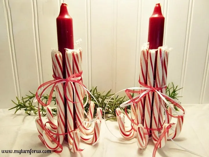 These Candy Cane Candlesticks make the cutest candy cane decorations. Easy and inexpensive candy cane candle holder using candy canes and ribbon.