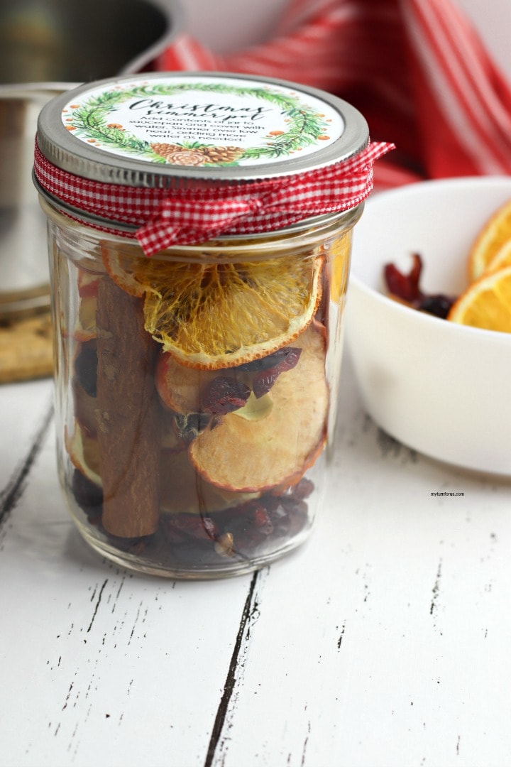 This simmer pot gift is made with homemade Christmas Potpourri like dried oranges, apples and cranberries.Â