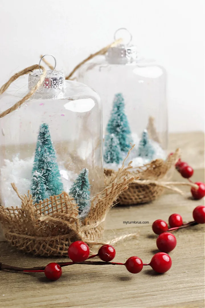 These burlap wrapped Farmhouse snow globes bring a certain vibe to your country Christmas decor. Â These mini snow globe Christmas ornaments are not so small that they go unnoticed but are just small enough to be quaint.Â