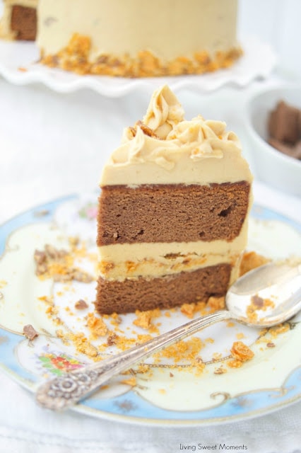 This Cake Recipe is made from scratch and is a moist chocolate cake with a peanut butter frosting and butterfingers