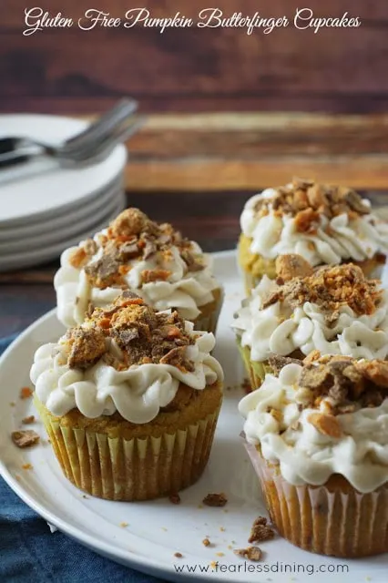 Gluten free pumpkin Butterfinger cupcakes topped with Butterfinger candy bar crumbles