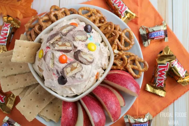 Fat free cream cheese and lite whipped topping and Snickers, Twix, and M&M's provide the sweetness for this Halloween treat