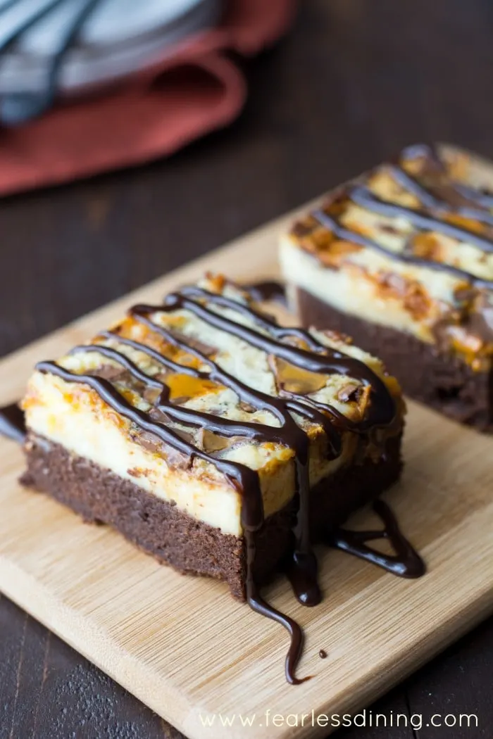 A gluten free chocolate moist brownie topped with cheesecake, chopped Butterfinger candy, and fudge