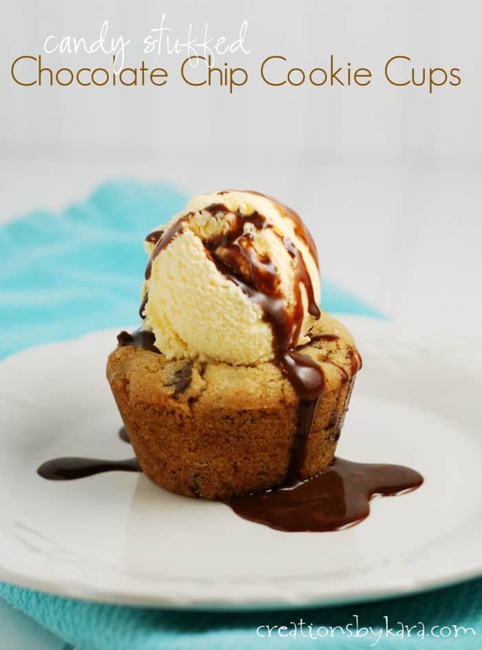 Take basic chocolate chip cookie dough, bake it in a muffin cup, and fill it with a mini candy bar for an over the top awesome dessert