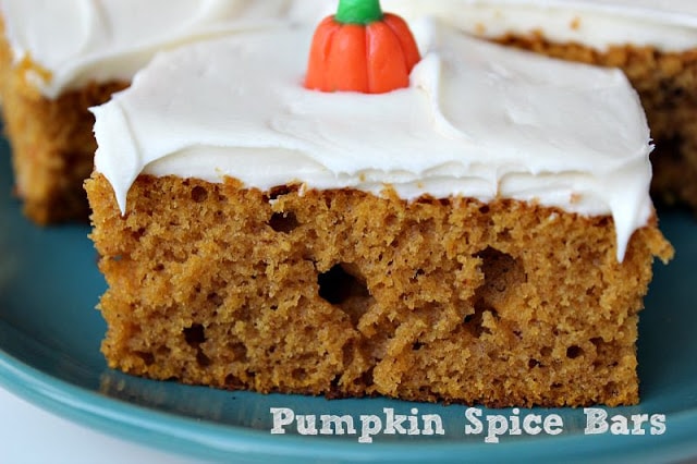 A flavorful bar with homemade cream cheese frosting with fun little candy pumpkins on top