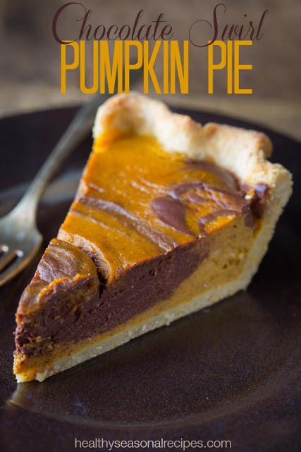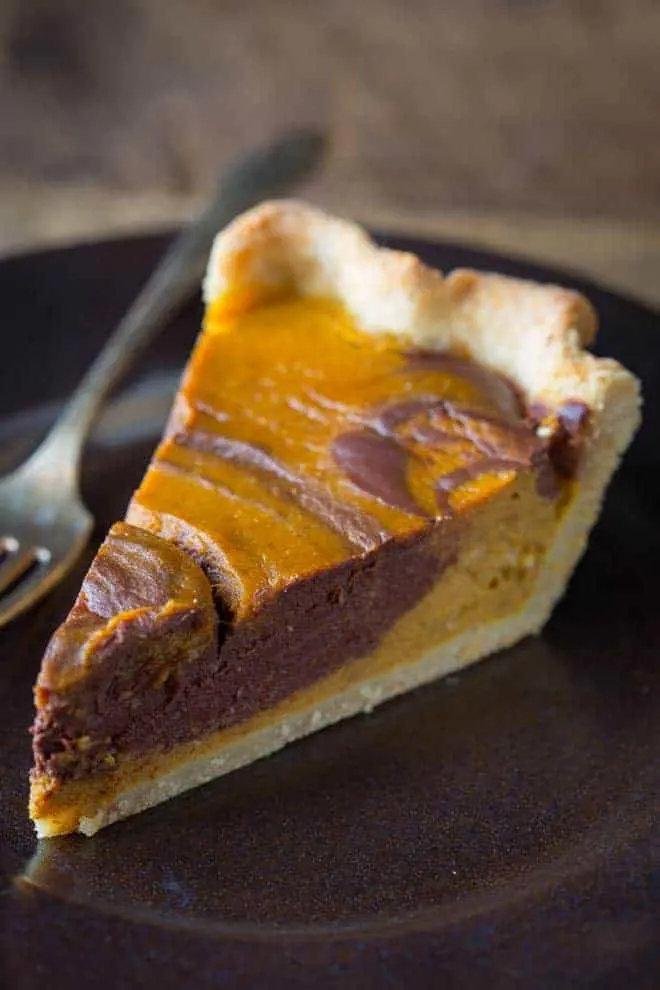 Chocolate swirl and creamy spiced pumpkin pie in a home-made whole-wheat crust
