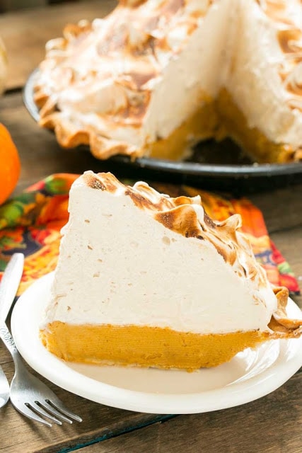 A delicious pumpkin pie with a toasted brown sugar meringue on top.