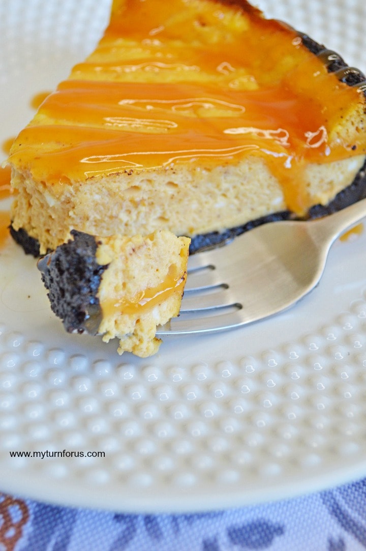 A pumpkin cheesecake with a caramel topping.  It’s an easy cream cheese-based cheesecake recipe with the addition of pumpkin puree.