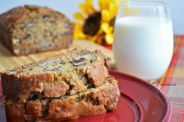 This easy maple pecan banana bread with brown sugar is baked in a loaf pan