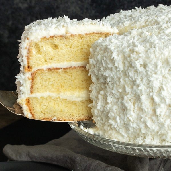 This classic coconut cake recipe uses fresh coconut and a secret ingredient to make the coconut cake extra moist!