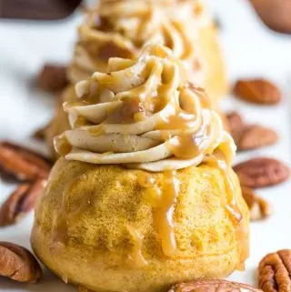 These delicious little cakes are topped with maple buttercream and butter pecan topping.Â