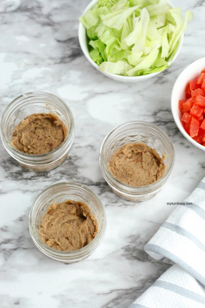 - Spread a layer of refried beans in the bottom of each of the small jelly jars.