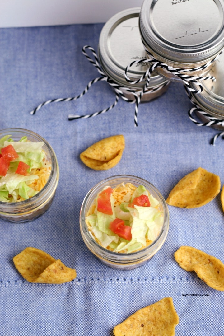 We didn’t put guacamole in the jars because of the tendency to brown even though we have an awesome recipe for no-brown guacamole. We decided to serve it on the side so guests could add it later. Also, we set out bowls of different salsas with varying degrees of spicy hot so everyone could top their taco dip in a jar with their own preferences. And you could serve them with tortilla chips or Frito chips like we did.