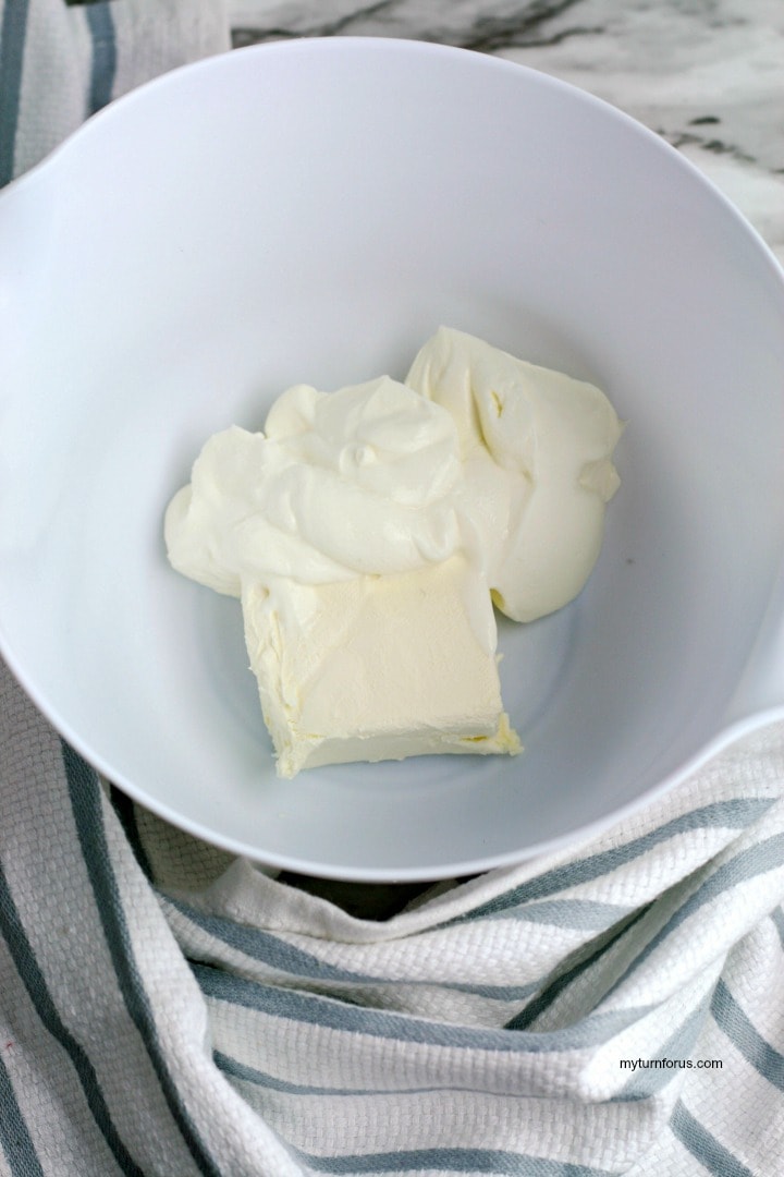 - Place the sour cream and cream cheese in a medium bowl and mix until very well combined.
