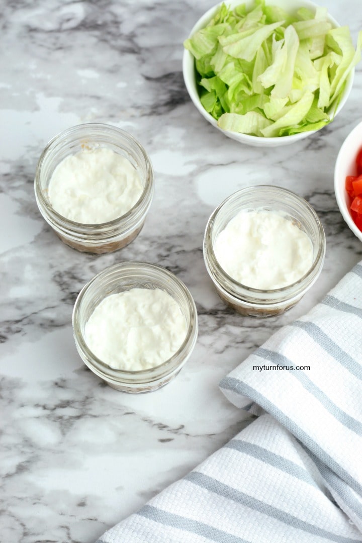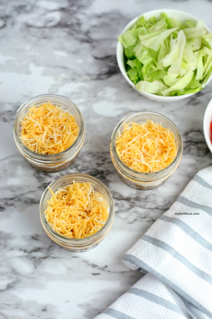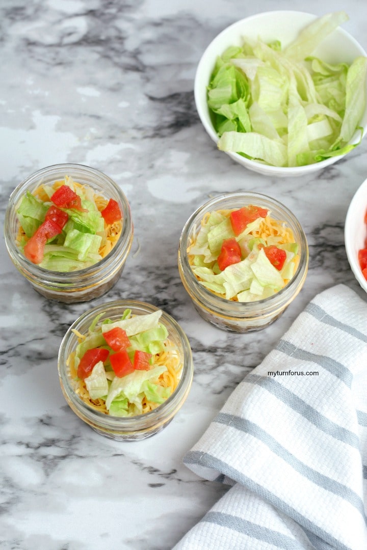 Finish your taco dip in a jar by garnishing with lettuce and chopped tomatoes.