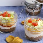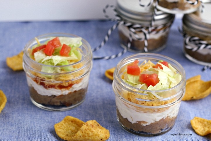 Make an easy 5 layer taco dip in a jar using 8 oz mason jelly jars. This individual dip in a jar is made with beans, cream cheese/sour cream and topped with salsa, lettuce, and tomatoes. We believe it will be a hit at any party, get-to-gather or at any of your game day celebrations.