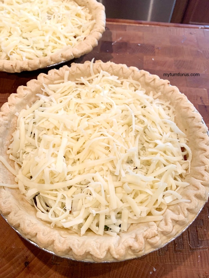 Divide your vegetable mixture between the two pie crusts, laying the veggies on the bottom of each pie shell, then add the bacon pieces to each pie.