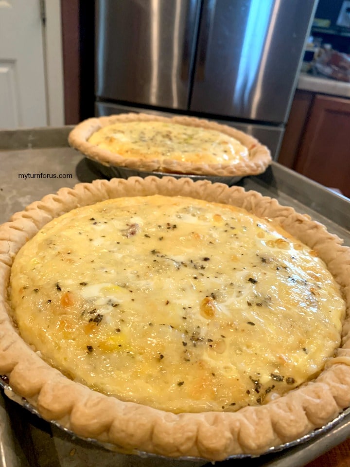 - Pour the egg mixture into each pie, equally. This is easier if the pies are placed on a cooking sheet prior to pouring and then just slide the rack with the pies into the oven. Make a “tent” with enough aluminum foil to cover both pies to prevent the crust from over browning. Bake for 15 minutes at 425 degrees F then turn the oven down to 325 degrees F and bake for another 15-20 minutes until the pies are just set in the center. Remove foil and cook 1-2 minutes until golden brown and knife inserted in center comes out clean.
