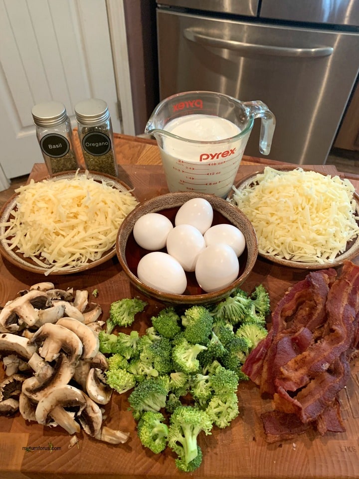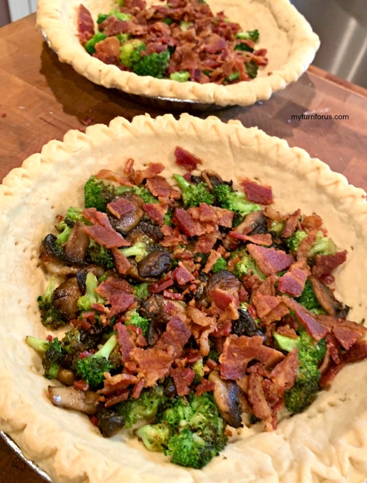 You can kinda dress this easy quiche up or dress it down as you see fit. Today we took our original broccoli mushroom quiche and added bacon pieces to it for added flavor. But you could add ham or sausage and you could also leave out the broccoli or mushrooms. It’s totally up to you. And we also made this quiche with frozen pie crust today to save some tim