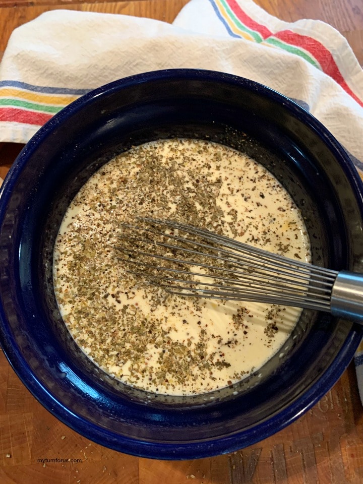 - Beat eggs in a medium bowl, add half & half, basil, oregano and salt and pepper to taste. Whip well to incorporate all the ingredients together.