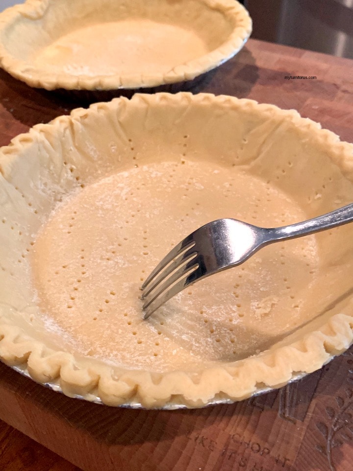 - Preheat your oven to 425 degrees F. Using a fork, poke holes in both pie crusts so heat can vent to prevent crust from bubbling up. Bake both pie crusts for about 8 minutes, then remove them and let cool on wire rack. While crusts are cooking, fry bacon until crisp and chop into about 1/2 inch pieces.