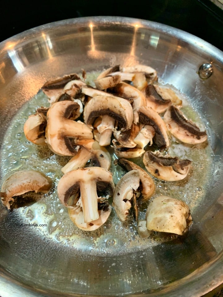 - Melt butter in large skillet and add mushrooms, raise temperature to med high heat to brown mushrooms. Because of the juice emitted from mushrooms during cooking, mushrooms have a tendency to just boil and become rubbery and tough. Temperature has to be high to brown them, also you can add 1 to 2 tablespoons of olive oil to help bring the butter up to higher temperature without burning.