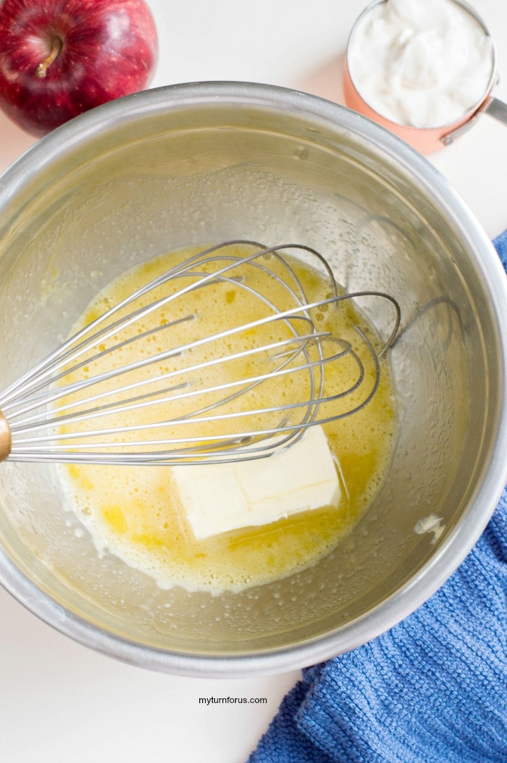 - Add butter into sugar and egg mixture and beat some more. Add vanilla.