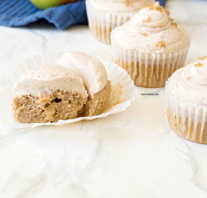 We hope you will love these cupcakes with the chunks of apple, sweet cinnamon, and nutmeg topped with this amazing cinnamon frosting.