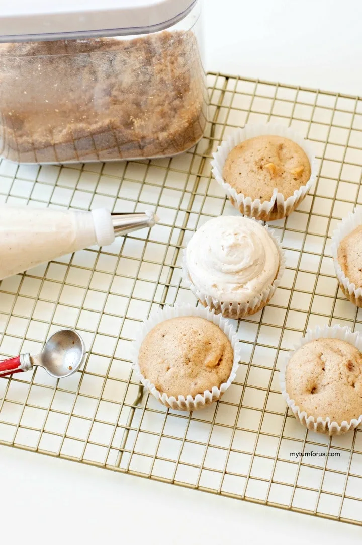 Scoop buttercream into a Piping Bag with Wilton tip #12 attached. Frost each cupcake generously with the cinnamon frosting and sprinkle with brown sugar.