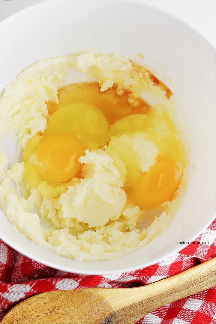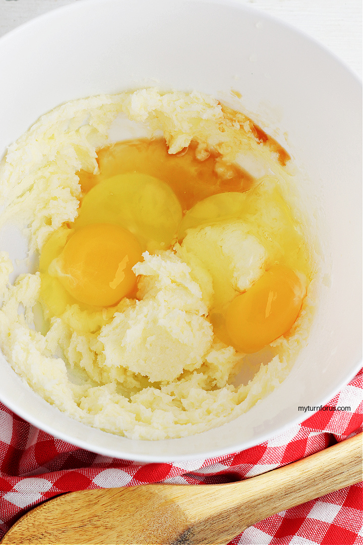 • In a large sized bowl, beat together the butter and sugar. Add the eggs and the vanilla and beat until very well combined.