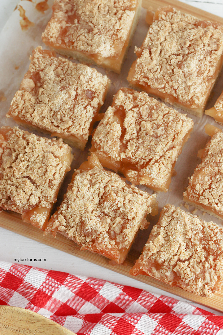 • Allow the apple pie bars to cool completely, then remove them from the pan by pulling the edges of the parchment paper up. Cut into bars before serving.