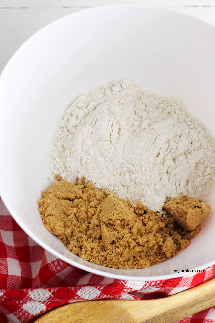 • Start the streusel topping by whisking together the brown sugar and flour in a medium size bowl.