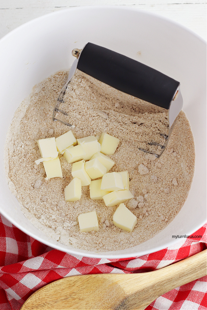 • Add in the cubed butter into the flour brown sugar mixture. Use a pastry blender or fork to combine until the mixture resembles coarse sand.