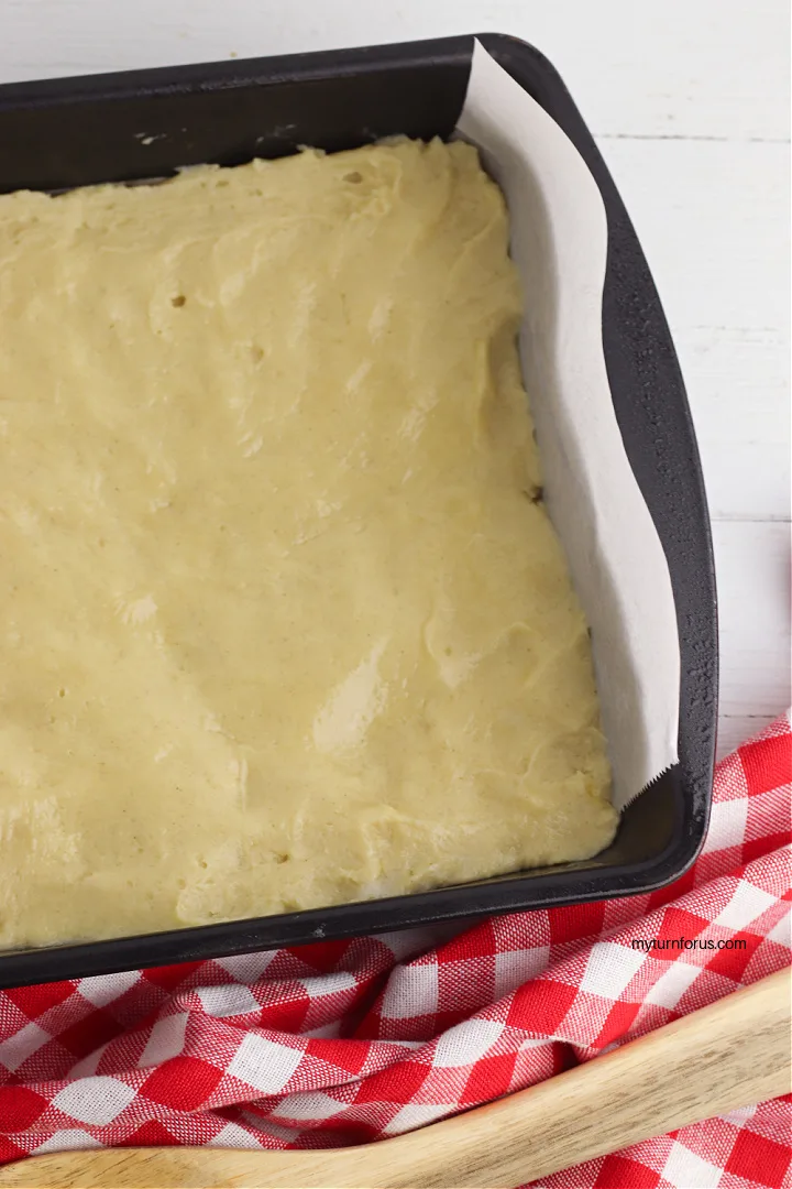 • Press the dough into the bottom of the parchment lined pan in an even layer as possible.