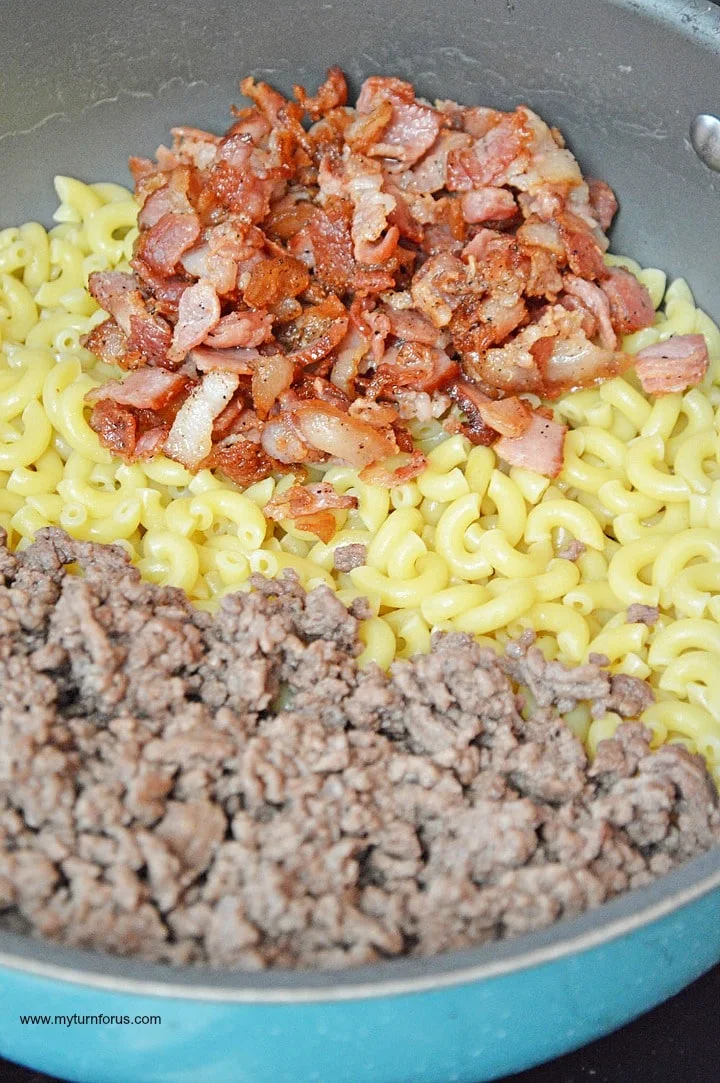 - Stir in cooked noodles, cooked bacon, beef broth, Worcestershire sauce, ketchup, and cornstarch.
