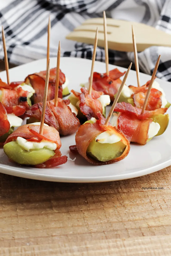 An easy Bacon wrapped pickles stuffed with cream cheese recipe. Make these bacon wrapped pickles in the oven for a delicious gluten free low carb appetizer.