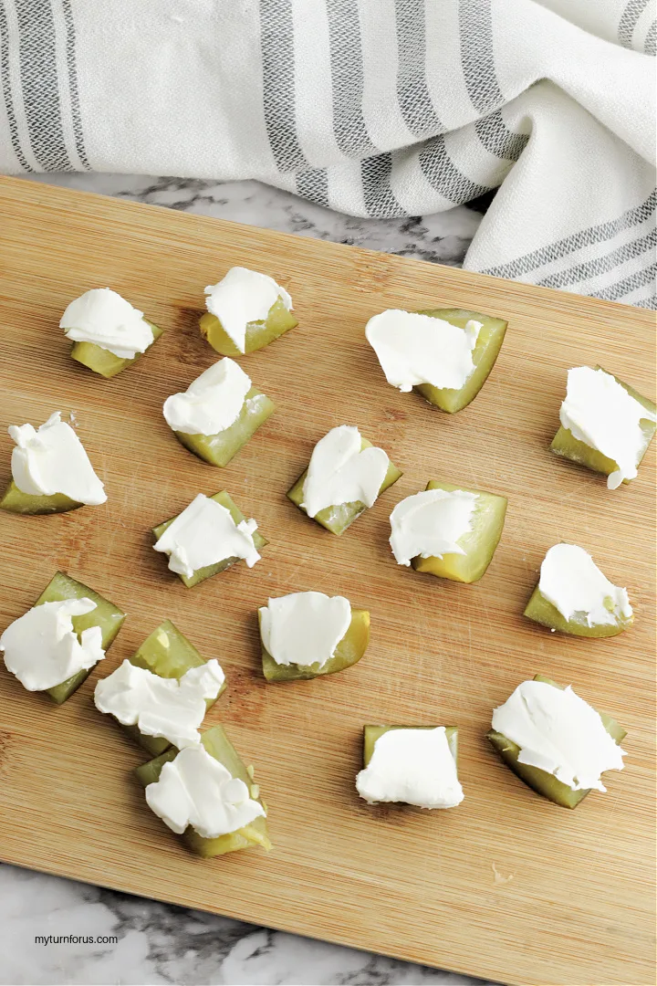 • Spoon a dab of cream cheese on top of each pickle piece using all the cream cheese.