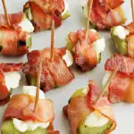 Keyword bacon wrapped pickles, bacon wrapped pickles in the oven, Bacon wrapped pickles stuffed with cream cheese, gluten free low carb appetizer