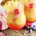This Bahama mama slushy contains two different rum flavors and is garnished with a slice of fresh pineapple and cherries. It’s colorful, delish and you can leave the rum out for a Bahama mama mocktail without alcohol. And the gorgeous colors and flavor combo of this sunny Caribbean cocktail will soon be a must for all your summer get-to-gethers.