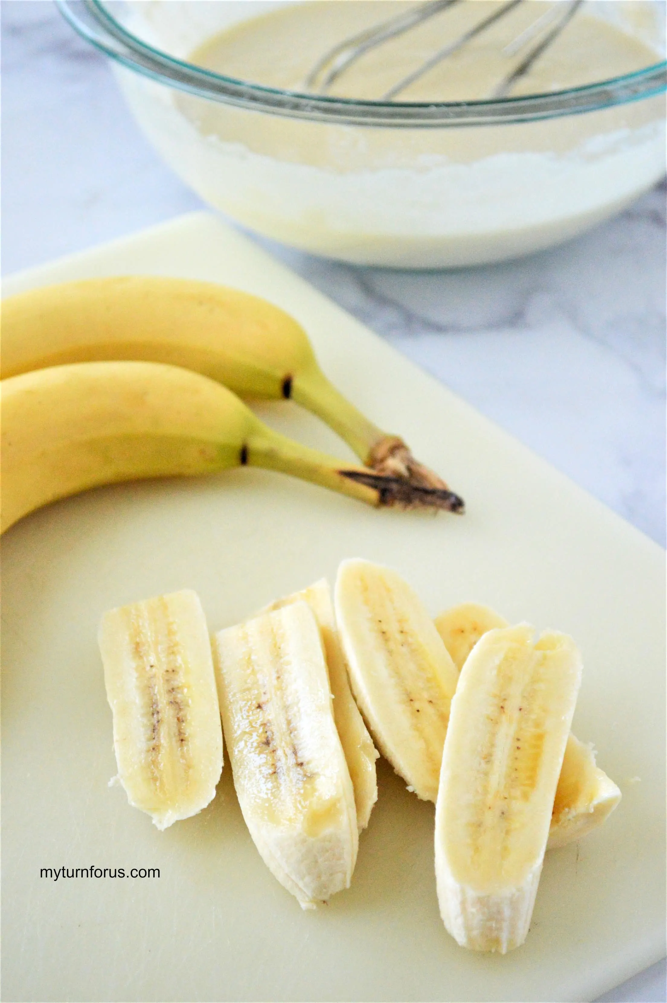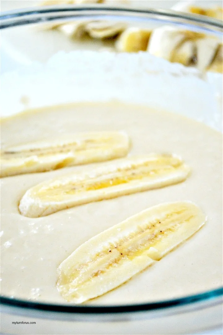 - Dip the banana slices into the pancake batter making sure to completely cover each side with the batter.