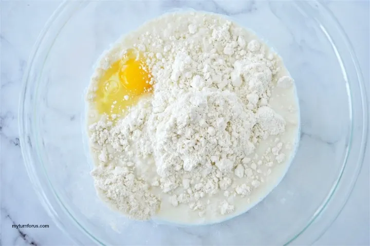 - In a large bowl, combine the Bisquick, milk and eggs.